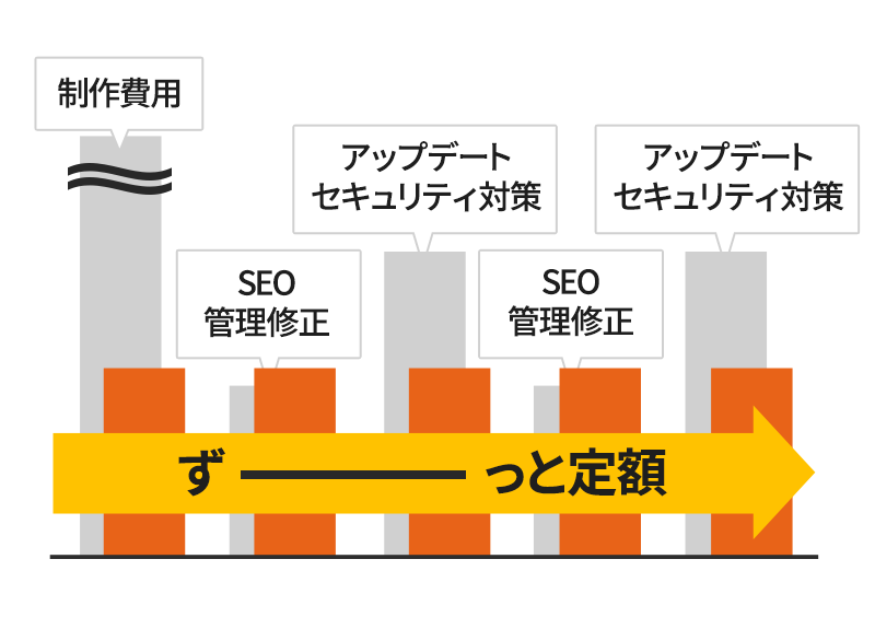 プロにホームページ制作を依頼すると、最低でも60万円、多いところで120万円以上、さらにその後の管理や修正は別途費用がかかるのが主流です。でも、「かかりつけ」なら全て込みで月額費用のみ!だから大きなお金の準備が不要で、様々なトラブルや急な変更にも即座に対応してくれる!